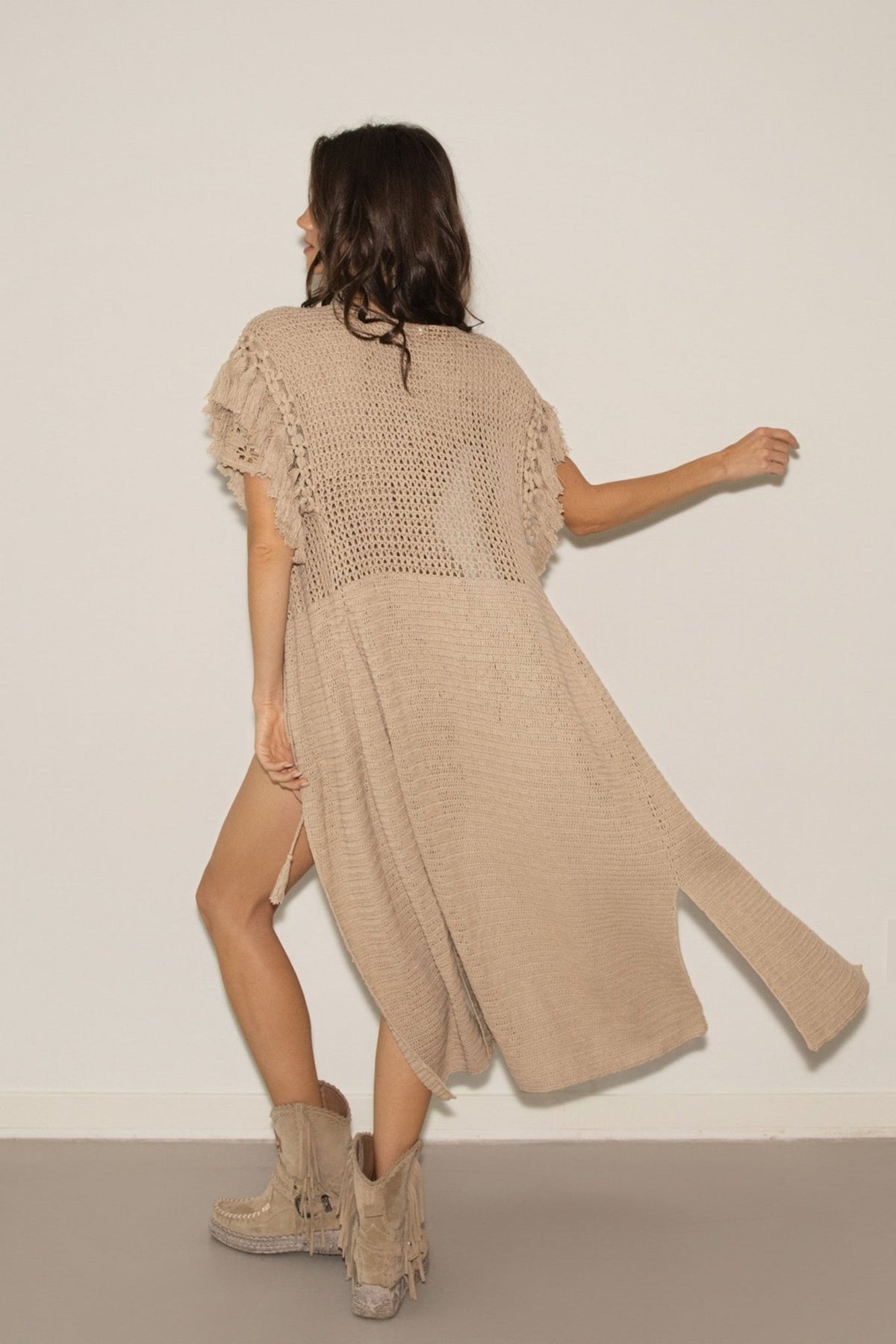 Ignite your style with this bold crochet kimono, adorned with striking fringe details that elevate every outfit. Rock it open or closed to unleash a captivating edge. The ultimate pick for a daring, effortlessly cool hippie or beach vibe.